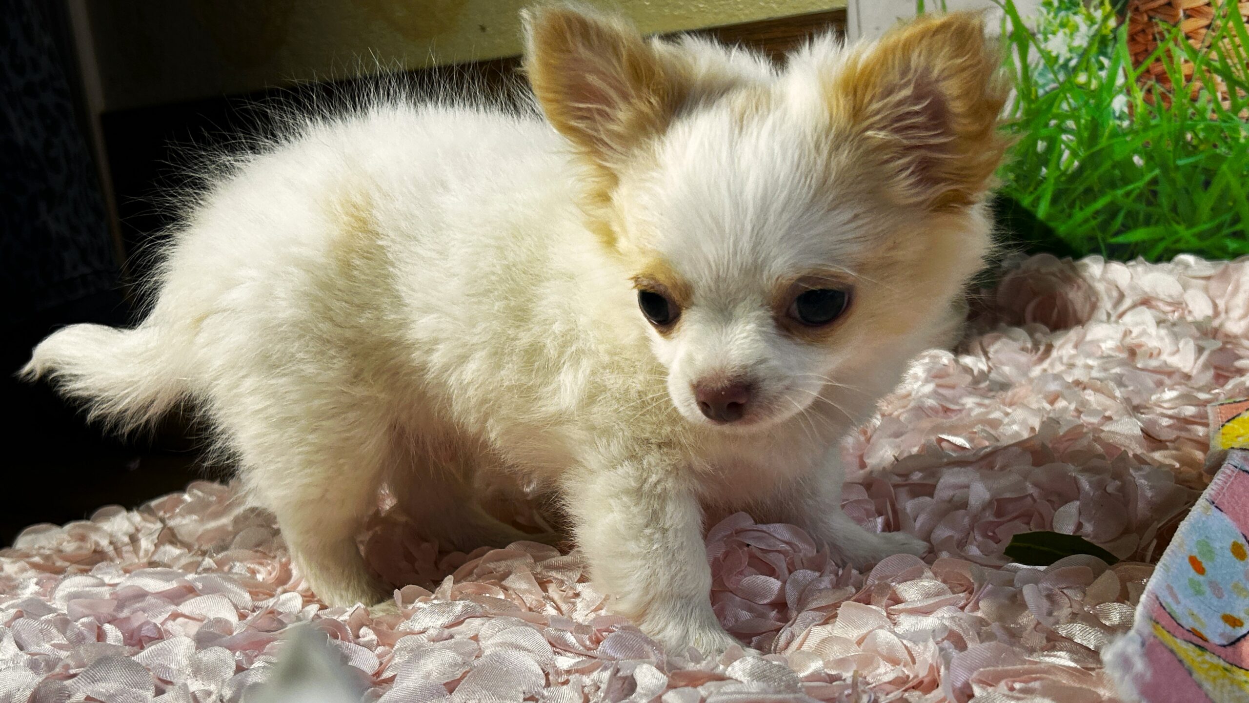 ARKS Stetson is a gorgeous white with cream spotted long-coat chihuahua. He is already correct at 2+weeks,..ears are already up, cream markings are just coming on. Stetson will be seen by my vet for a full exam and first set of puppy shots, and full AKC. Likely he will be standard size since he is a singleton to an older Mum. $1,895